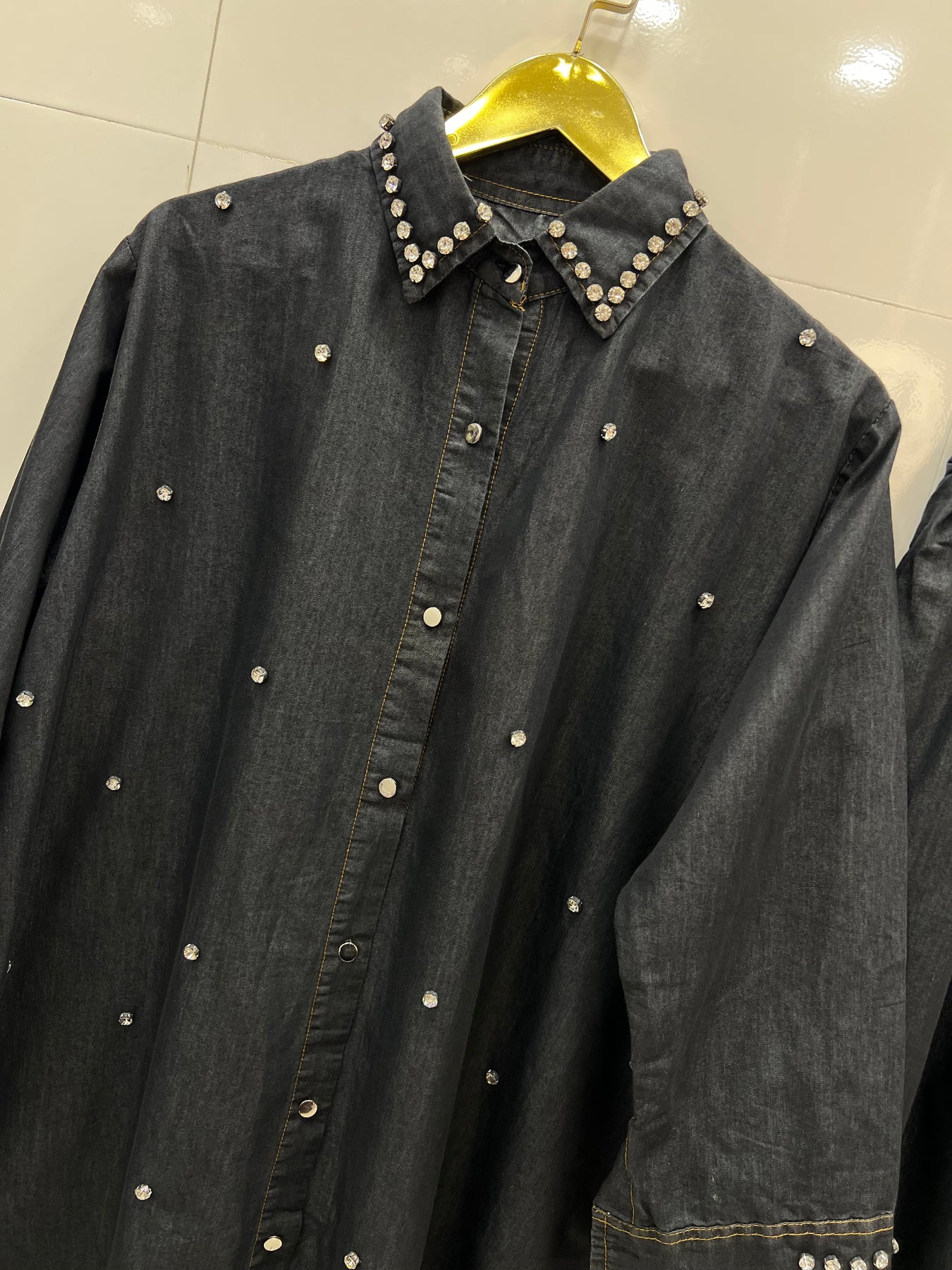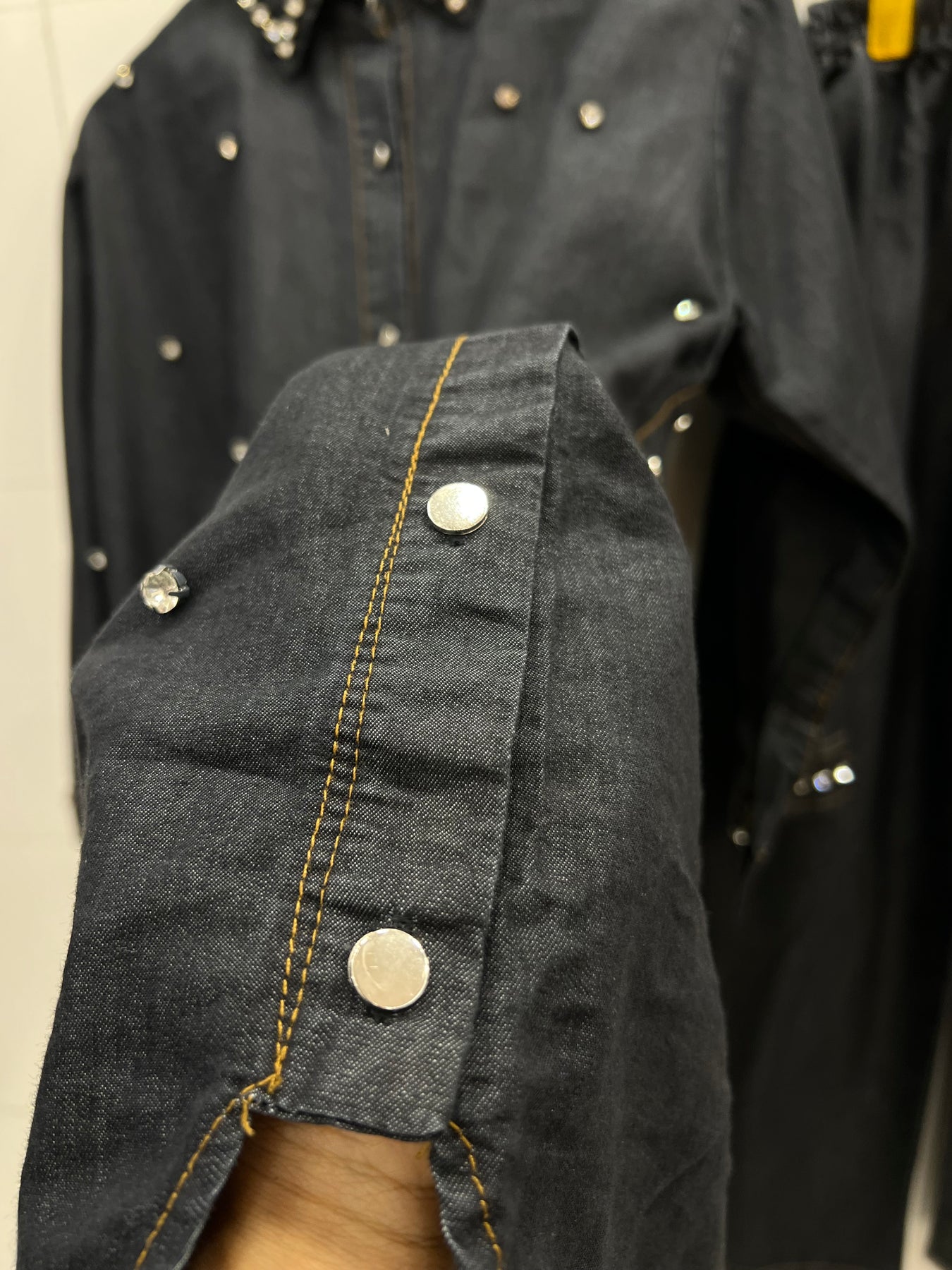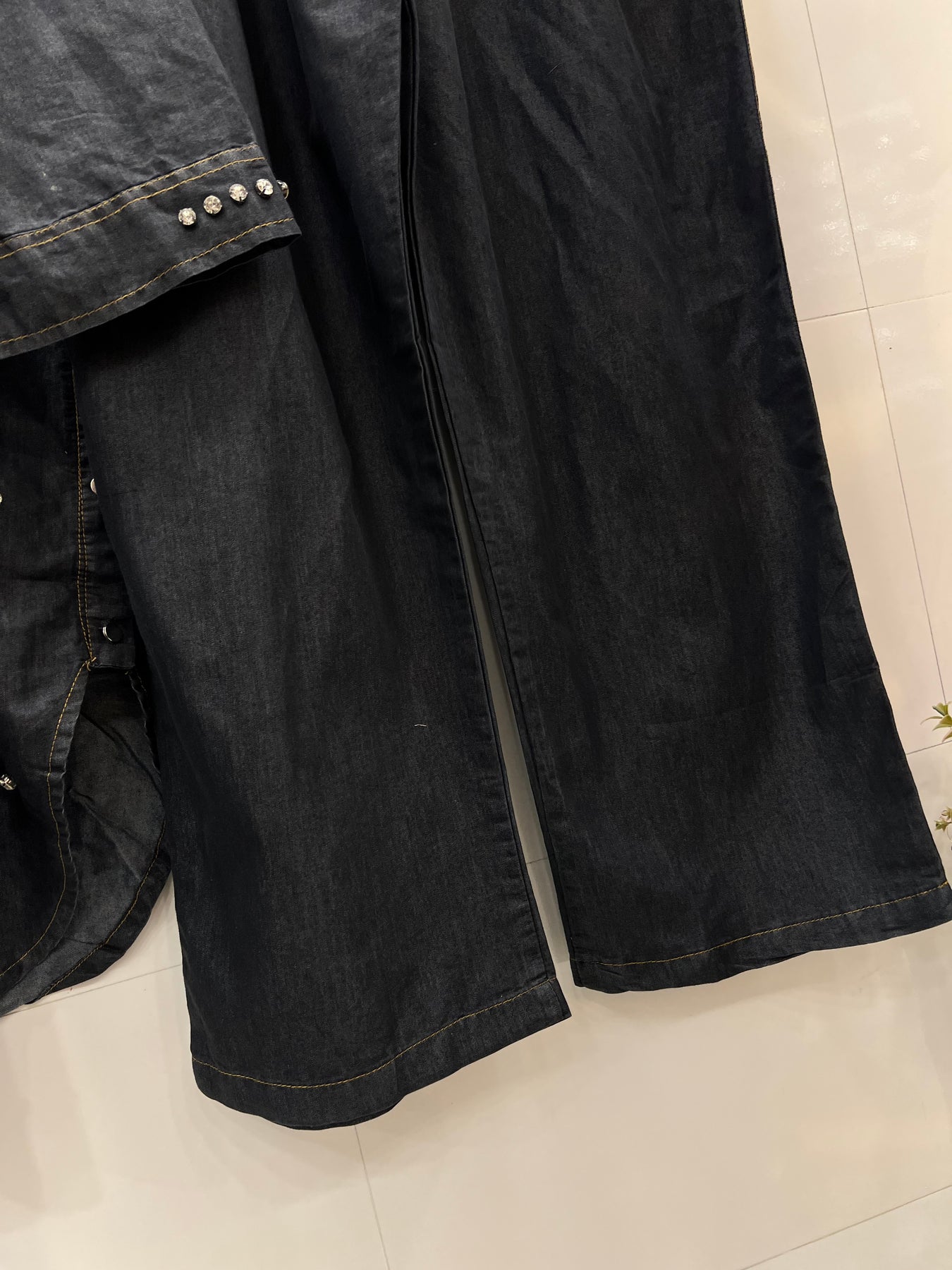 D.no:-2583.Upgrade your wardrobe with our Denim Co-ord set. This set features a stylish denim top adorned with stone work, adding a touch of elegance to your casual look. Crafted with high-quality denim, it offers durability and comfort, perfect for any occasion. Elevate your style game with this versatile set.