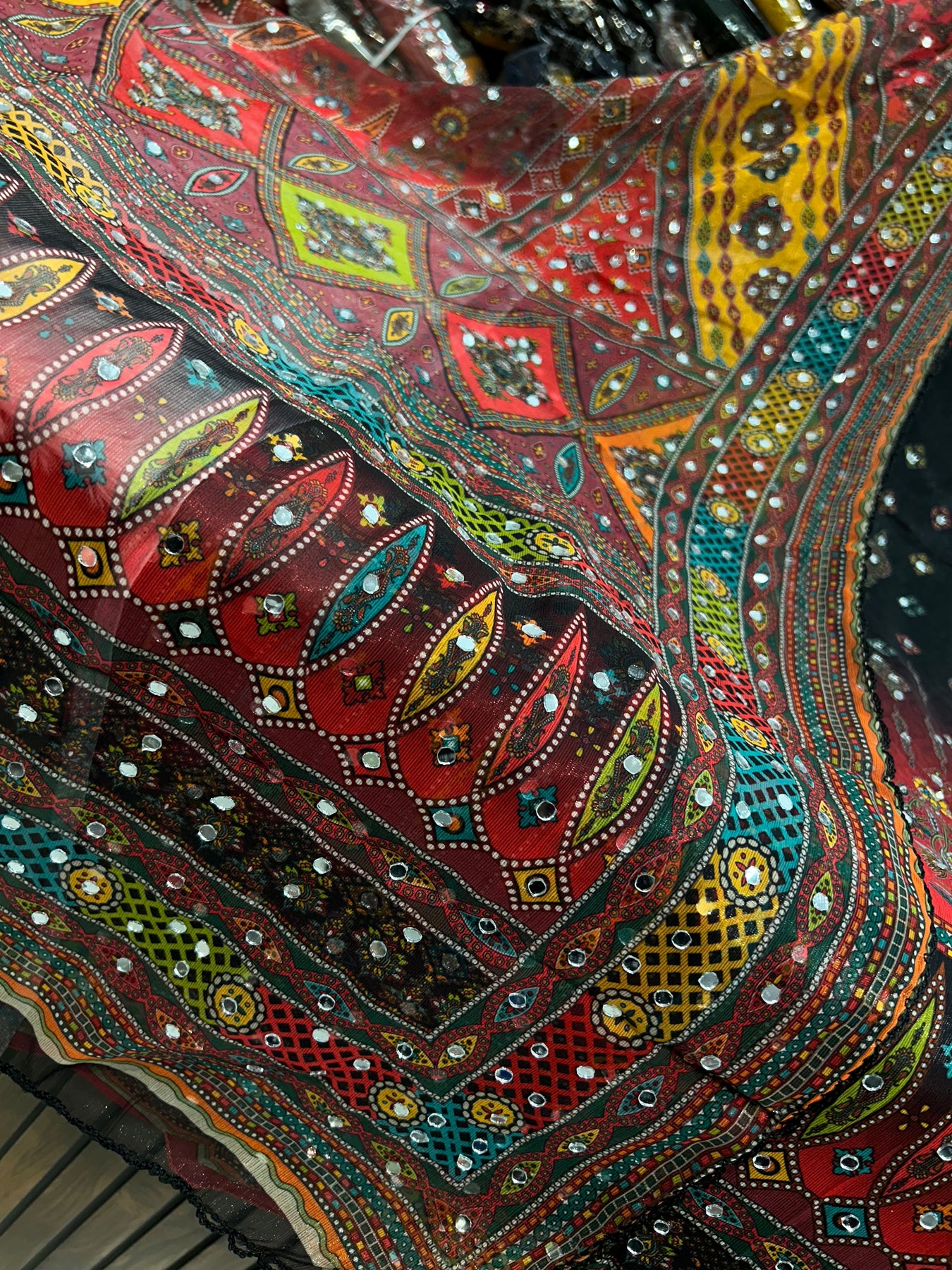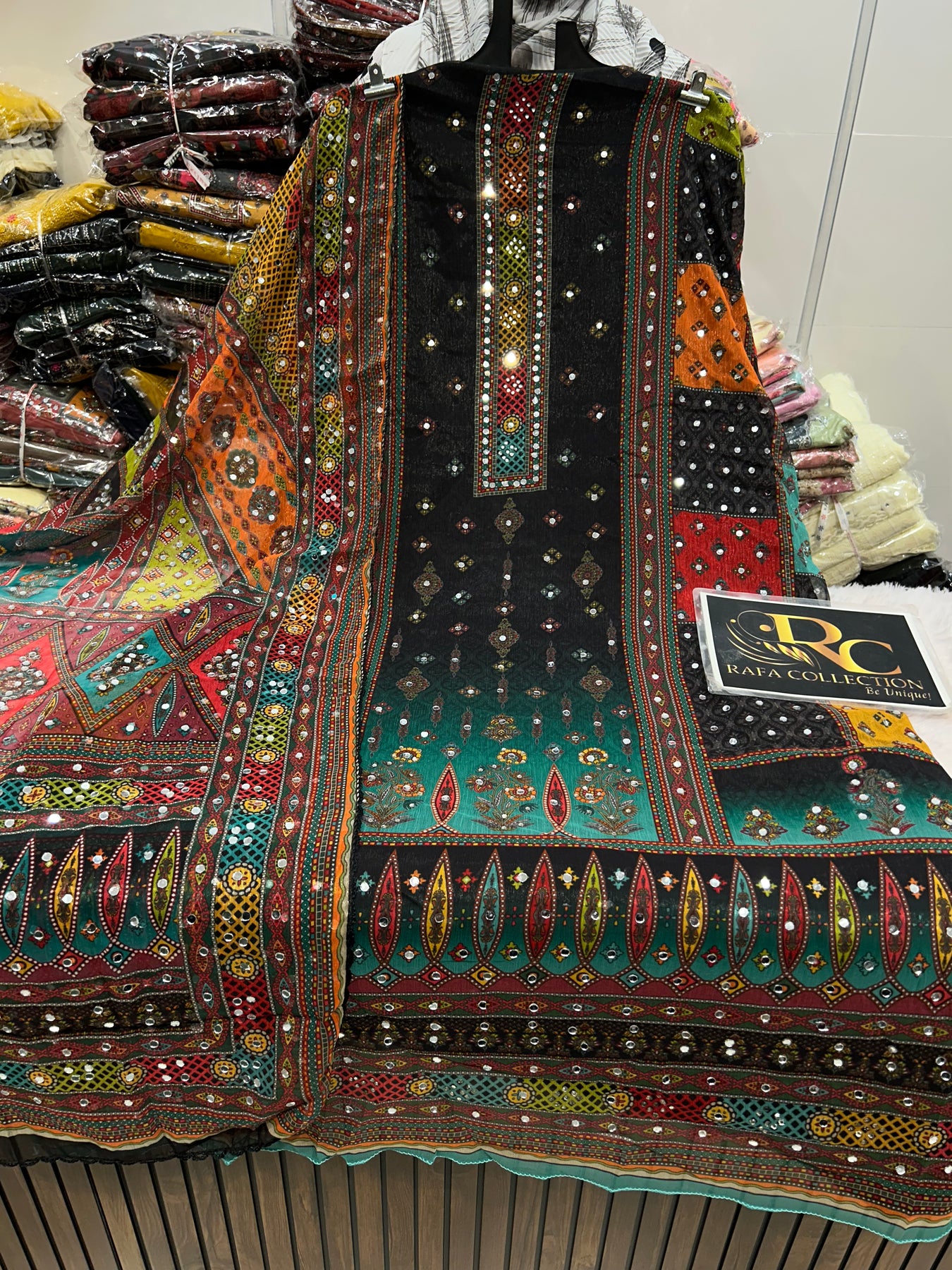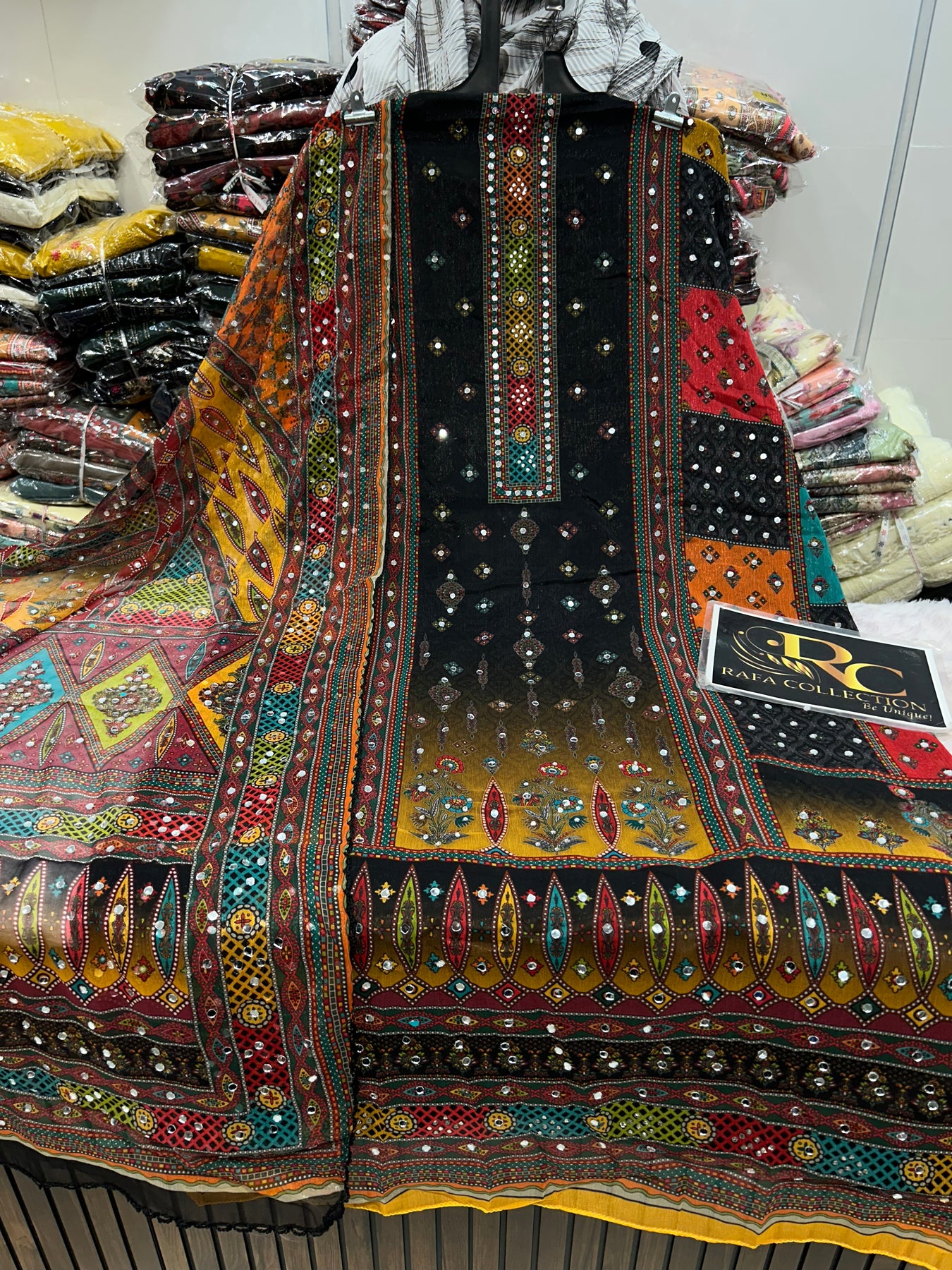 D.No:-1308. This pure organza unstitched suit features intricate mirror and stone work, adding a touch of elegance to any outfit. The multi-color design lends versatility, allowing you to mix and match with different outfits. Elevate any look with this expertly crafted and stylish dupatta.
