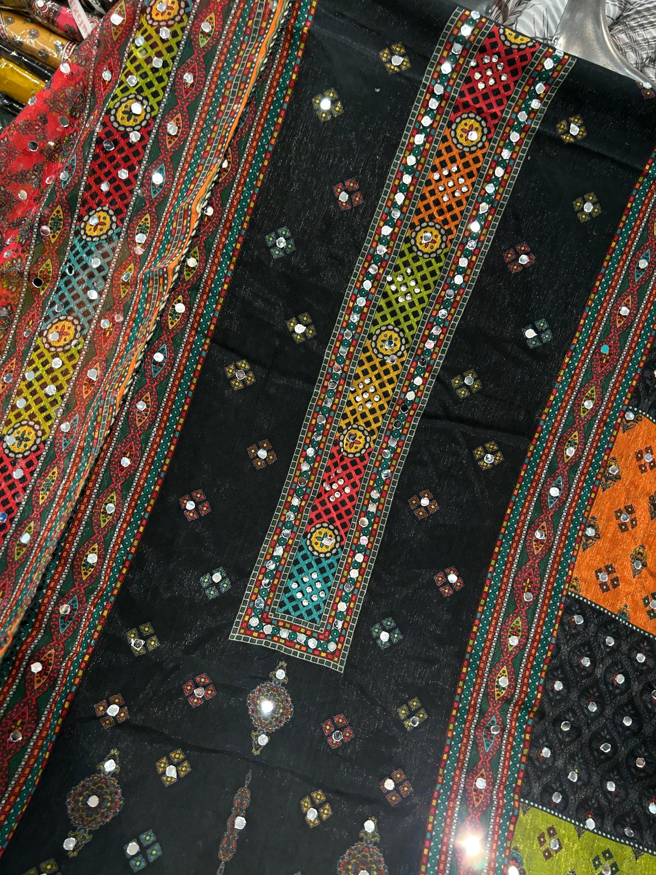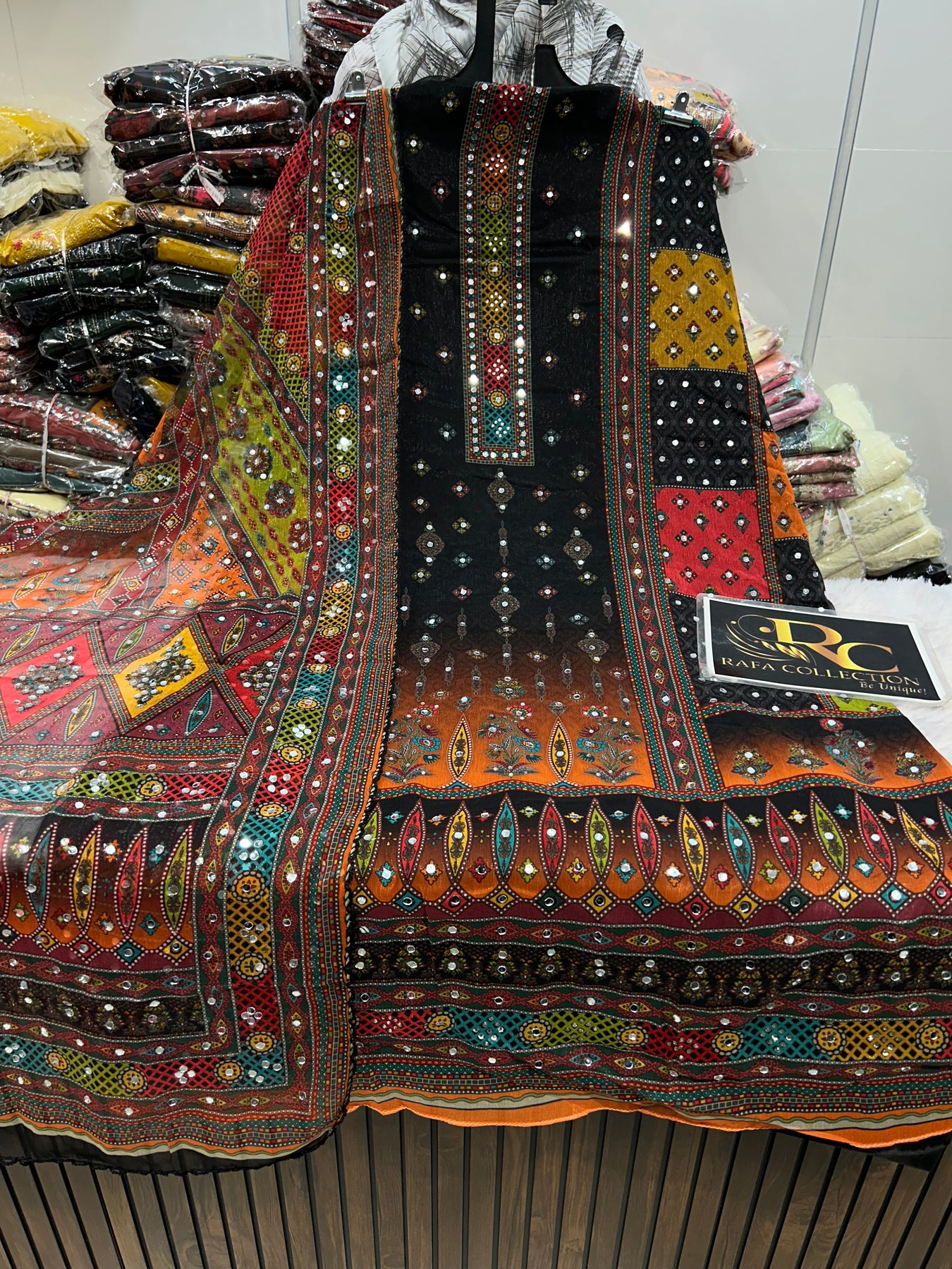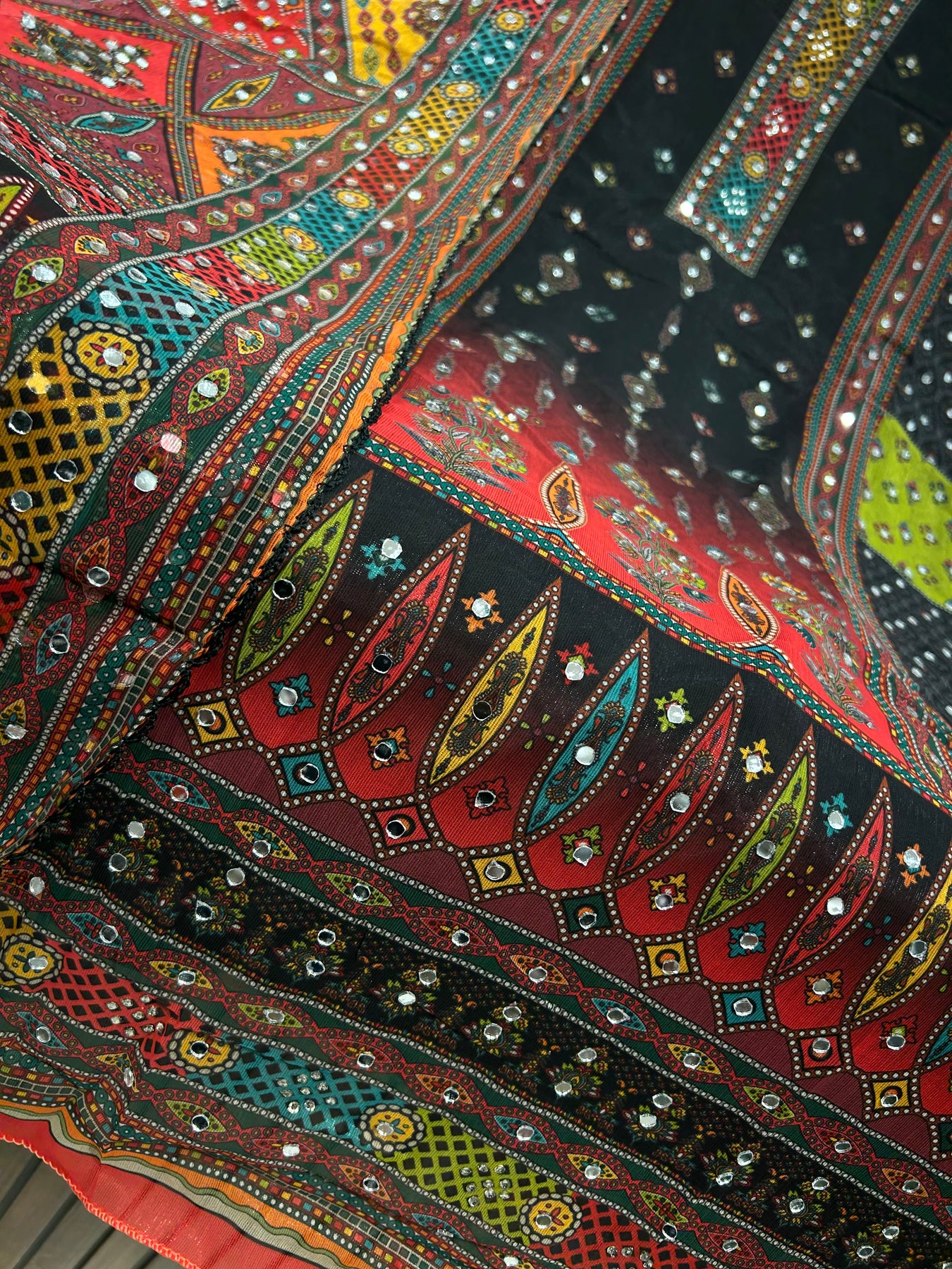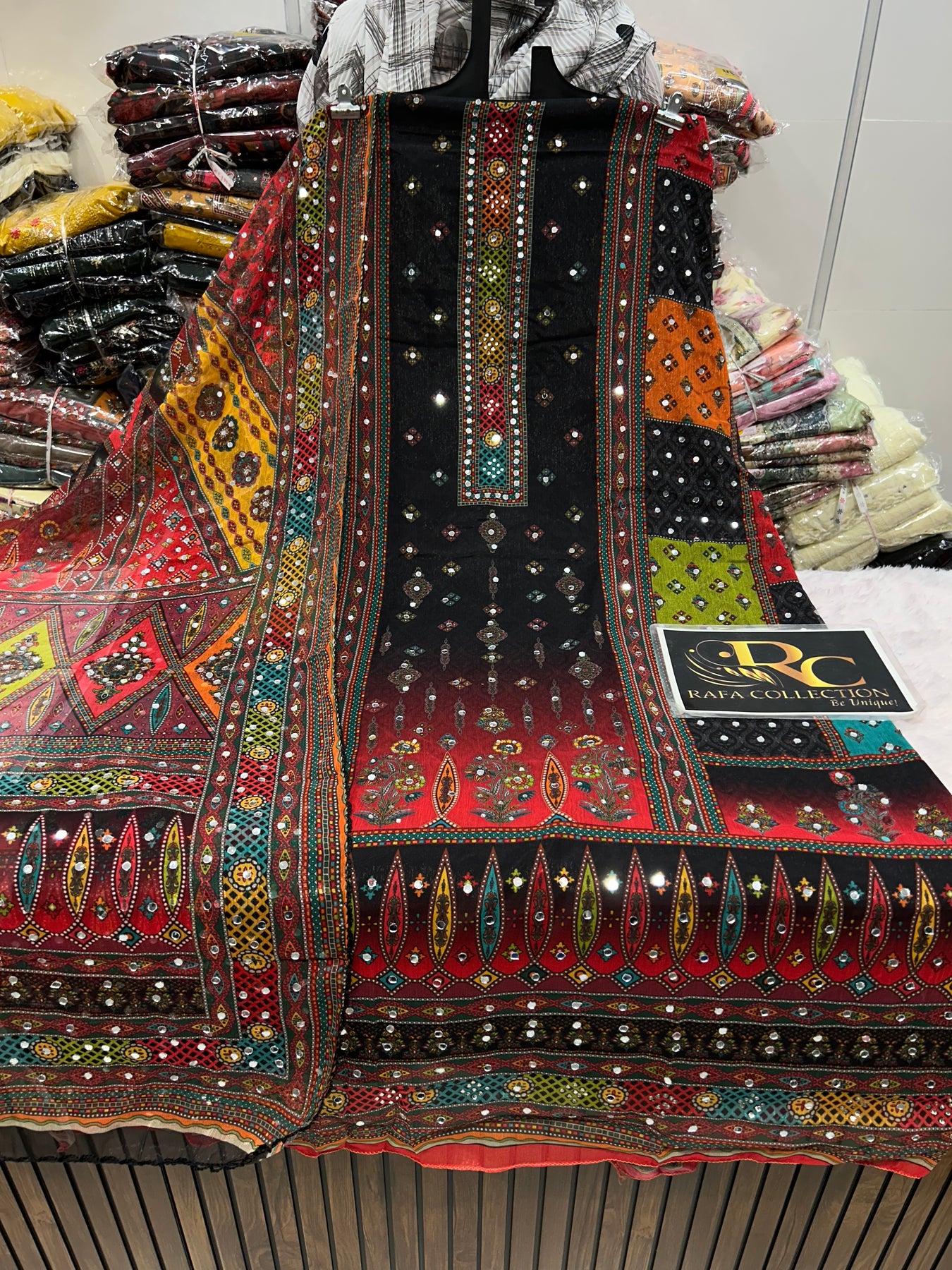 D.No:-1308. This pure organza unstitched suit features intricate mirror and stone work, adding a touch of elegance to any outfit. The multi-color design lends versatility, allowing you to mix and match with different outfits. Elevate any look with this expertly crafted and stylish dupatta.