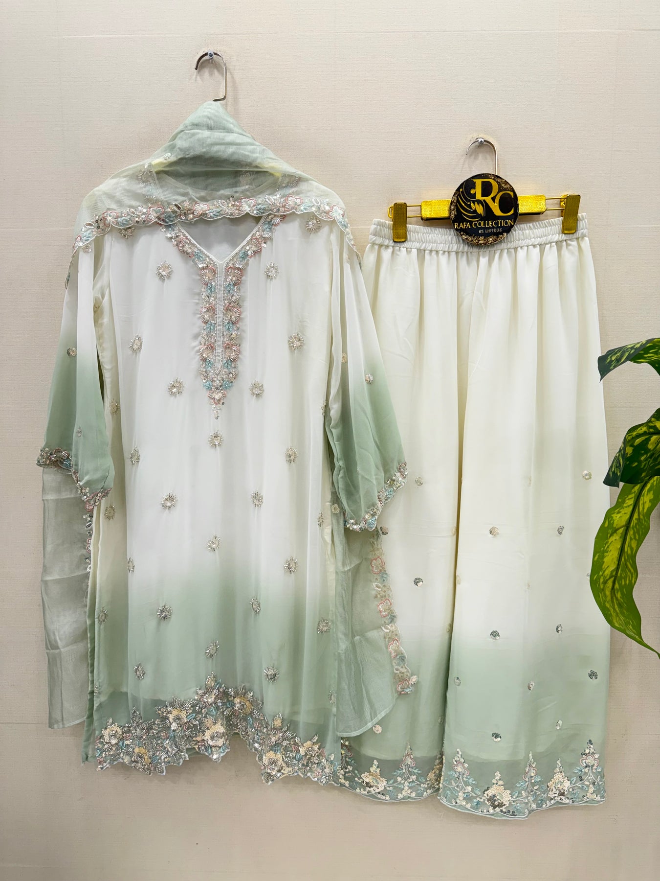 Bottom:-georgette palazzos with handwork and sequence zari work