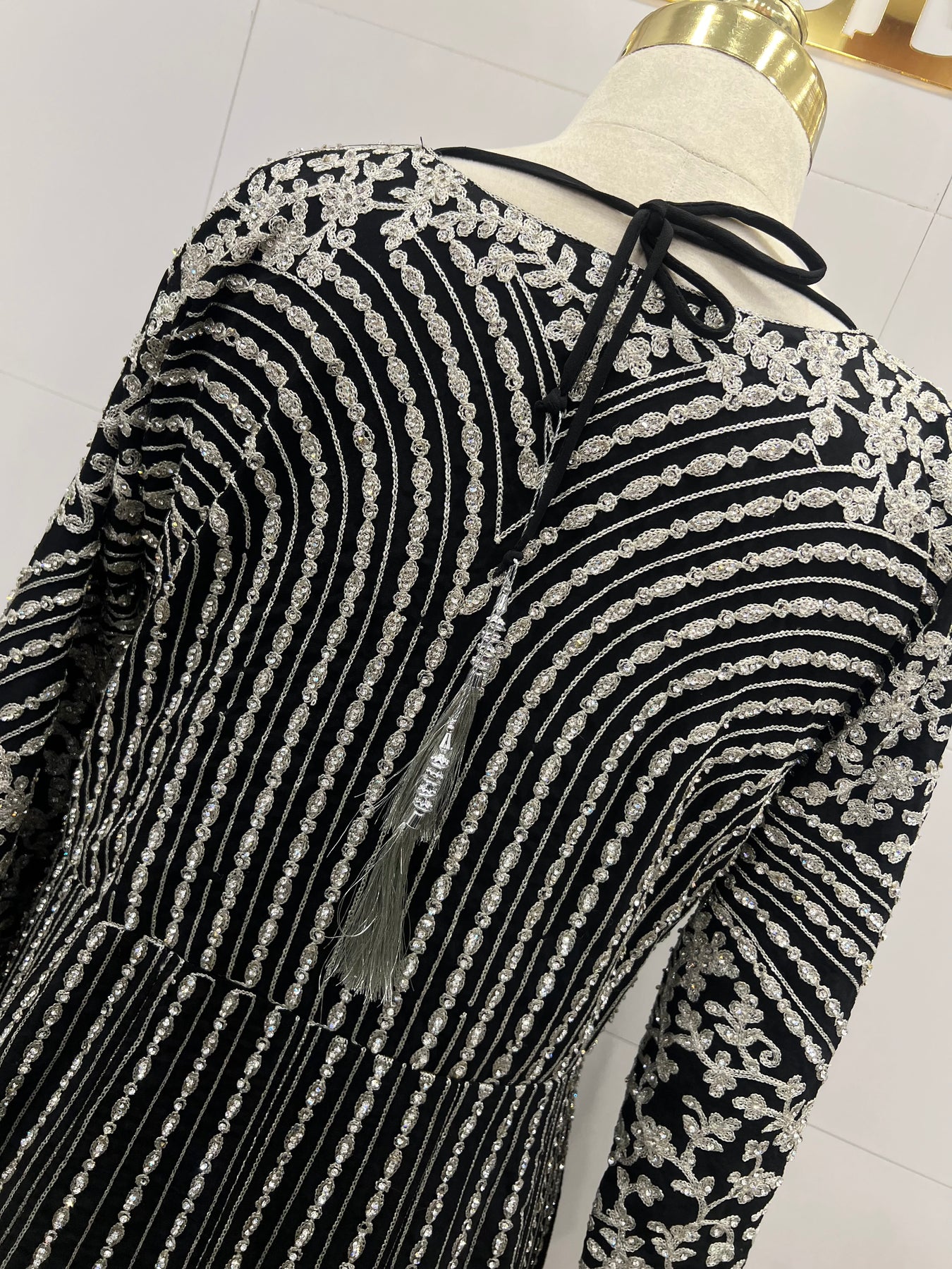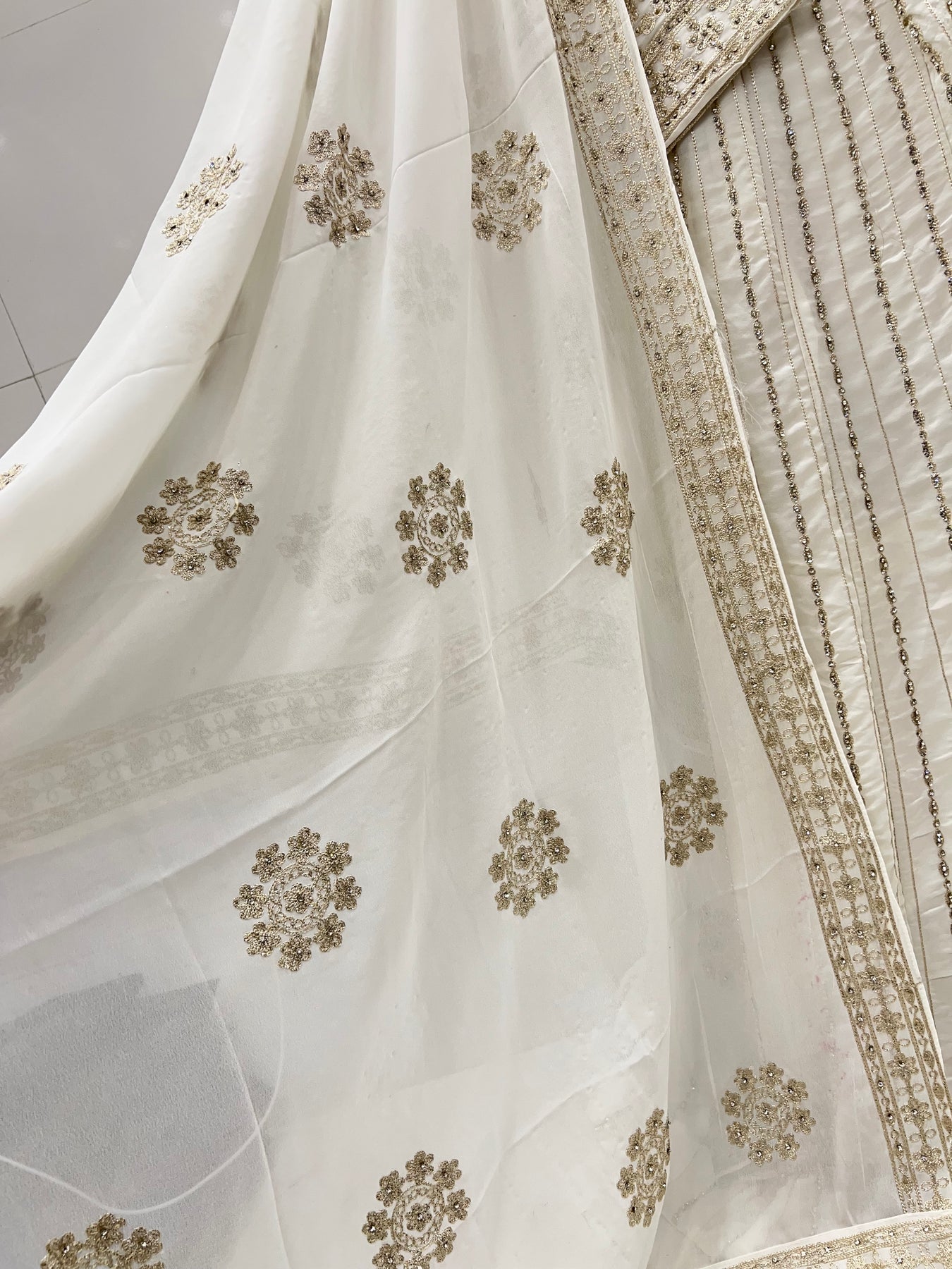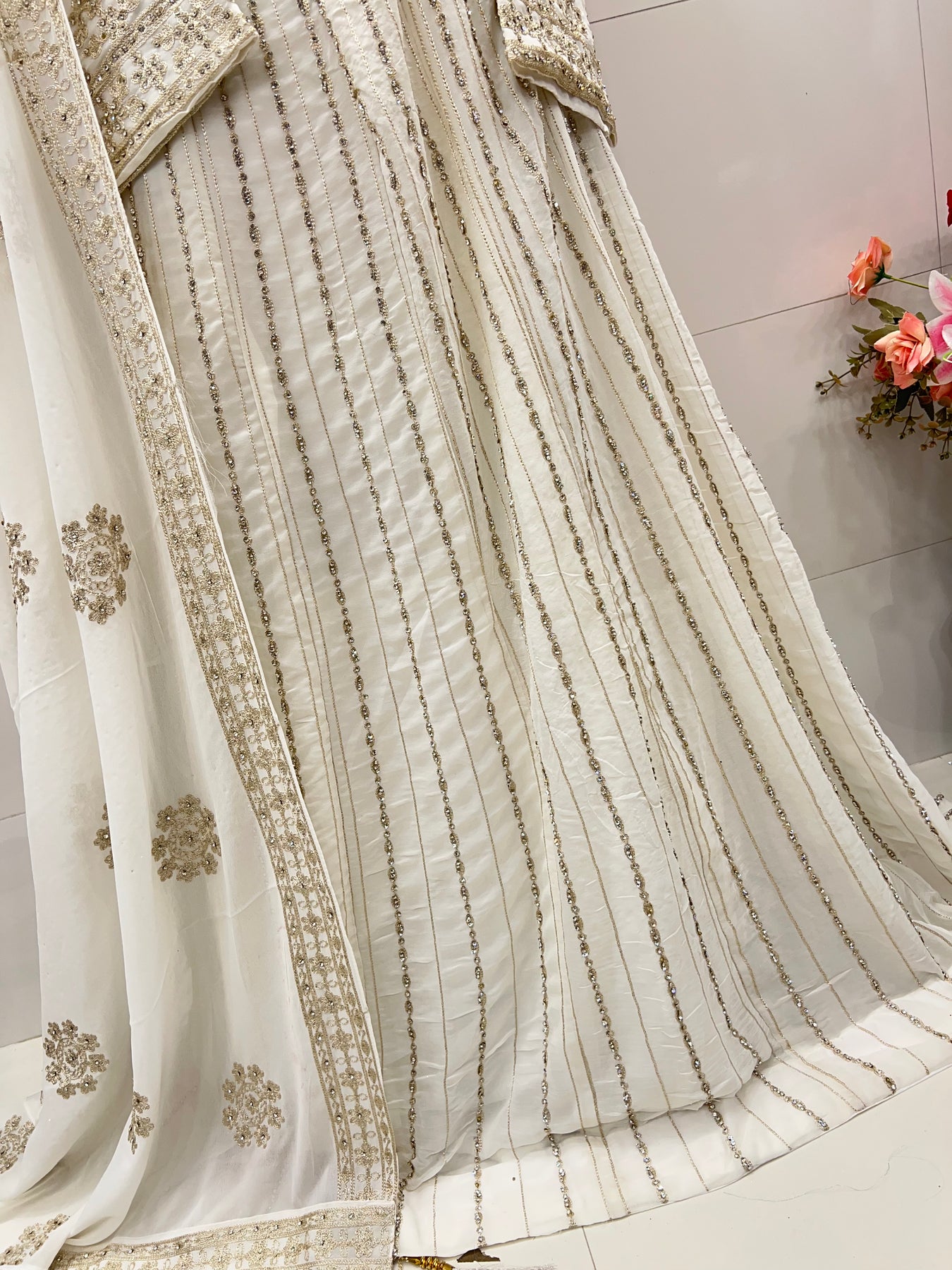 D no :- 126213 This Pakistani wedding gown boasts a heavy georgette fabric adorned intricate embroidery and zarkan work. The result is126213 stunning and elegant dress perfect for any bride-to-be. Elevate your special day with this expertly crafted, luxurious gown, sure to make a lasting impression.