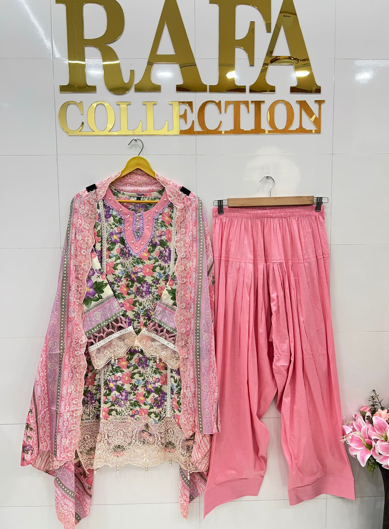 D no :- 2590 This Farshi Pakistani suit (style ) features a cotton printed top with delicate embroidery chickenKari, lace work, and tassels. With its unique design and high-quality fabric, this suit offers comfort, elegance, and traditional flair. Perfect for any occasion, elevate your style and make a statement with this beautiful and stylish suit.